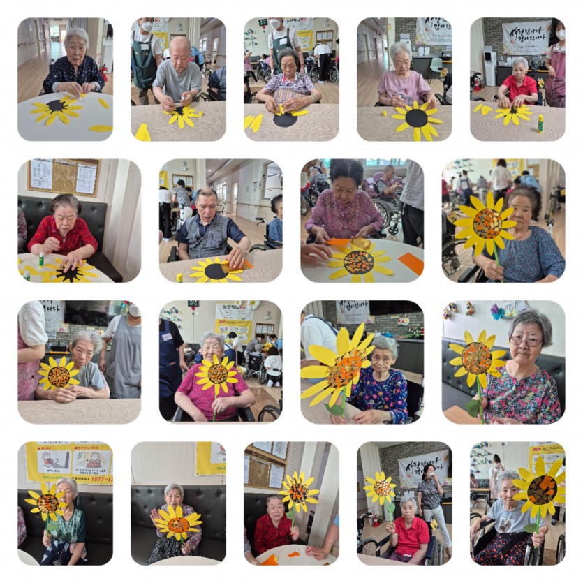 해바라기 만들기 프로그램은 계절감을 느끼게 해주며 미술. 인지. 소근육 운동에