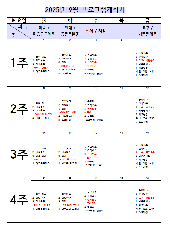 2025년 9월 프로그램계획서 페이지 정보 작성자 최고관리자 댓글 0건 조회 69회 작성일 25-09-02 10:14 목록 답변 본문 *과목별 프로그램 교자재는 상황에 따라 변동될 수 있습니다. 이전글2025년 9월 식단표 25.09.02 다음글2025년 8월 식단표 25.07.31 댓글 0 댓글목록 등록된 댓글이 없습니다.